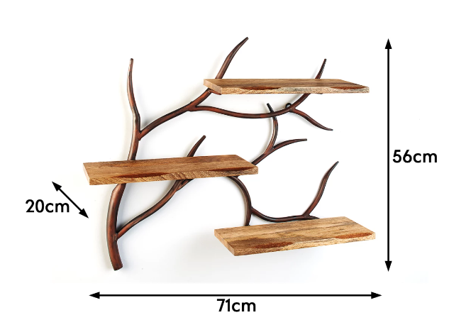 Moderní nástěnná police ve tvaru větve. Ozdobná kovová police se 3 dřevěnými panely nabízí dostatek prostoru pro dekorace, krásné maličkosti nebo obrázky.