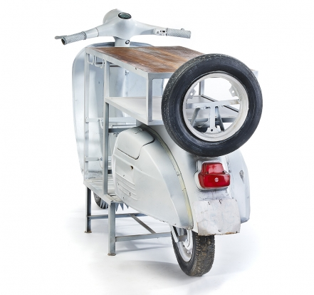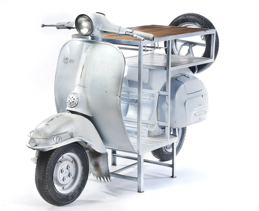 Vintage barový stolek se zásuvkami na lahve ve tvaru skútru